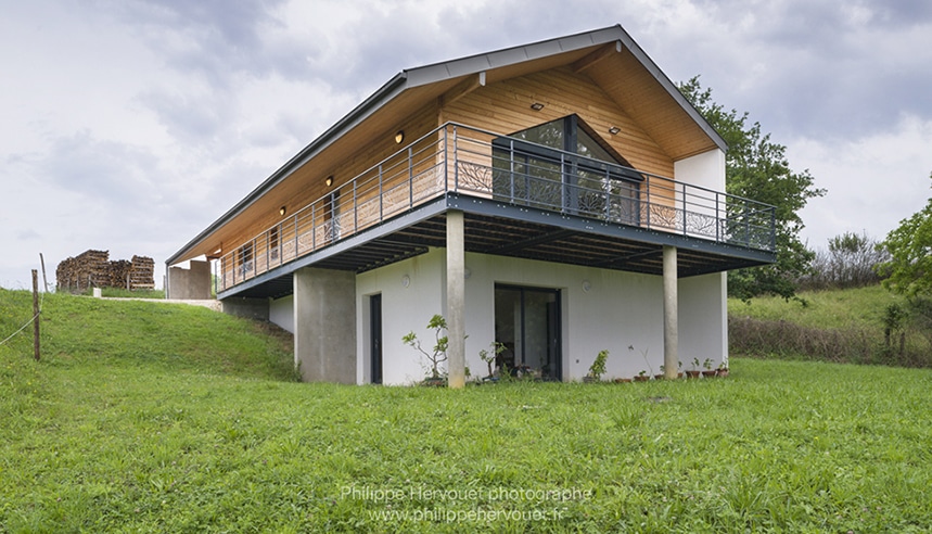 Cette maison écologique se veut exemplaire. Orientée plein sud, elle possède de grandes ouvertures assurant les apports nécessaires au chauffage de la maison.