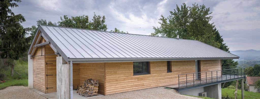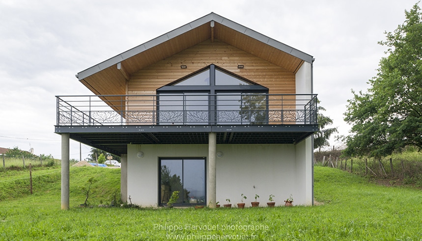 La construction de cette maison écologique dans l’Ain a été réalisée selon une forme simple tout en longueur, avec un bâtiment qui suit la pente du terrain.