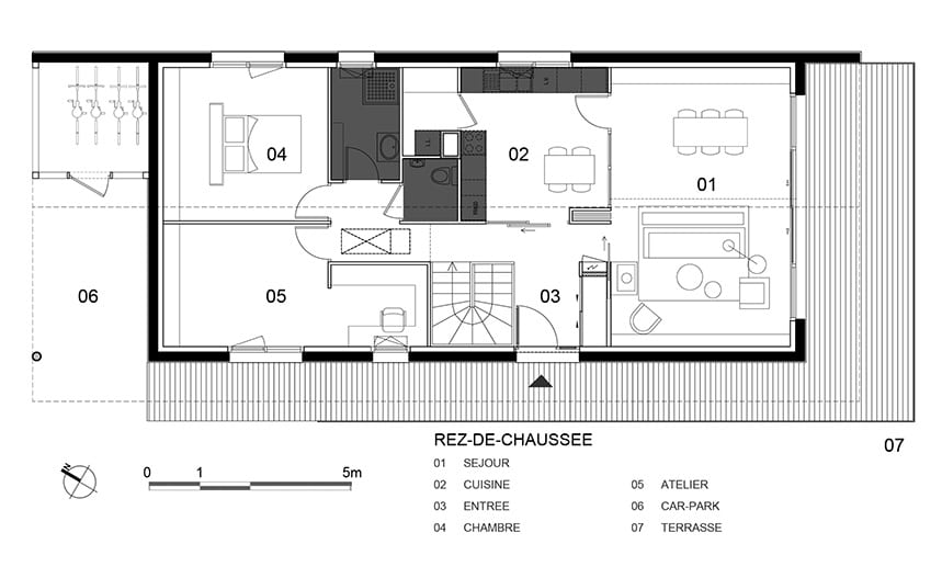 • Des matériaux nobles et écologiques sont utilisés comme le bois pour la structure et le bardage, ainsi que le zinc pour la couverture du toit à deux pans et le revêtement de la façade est.